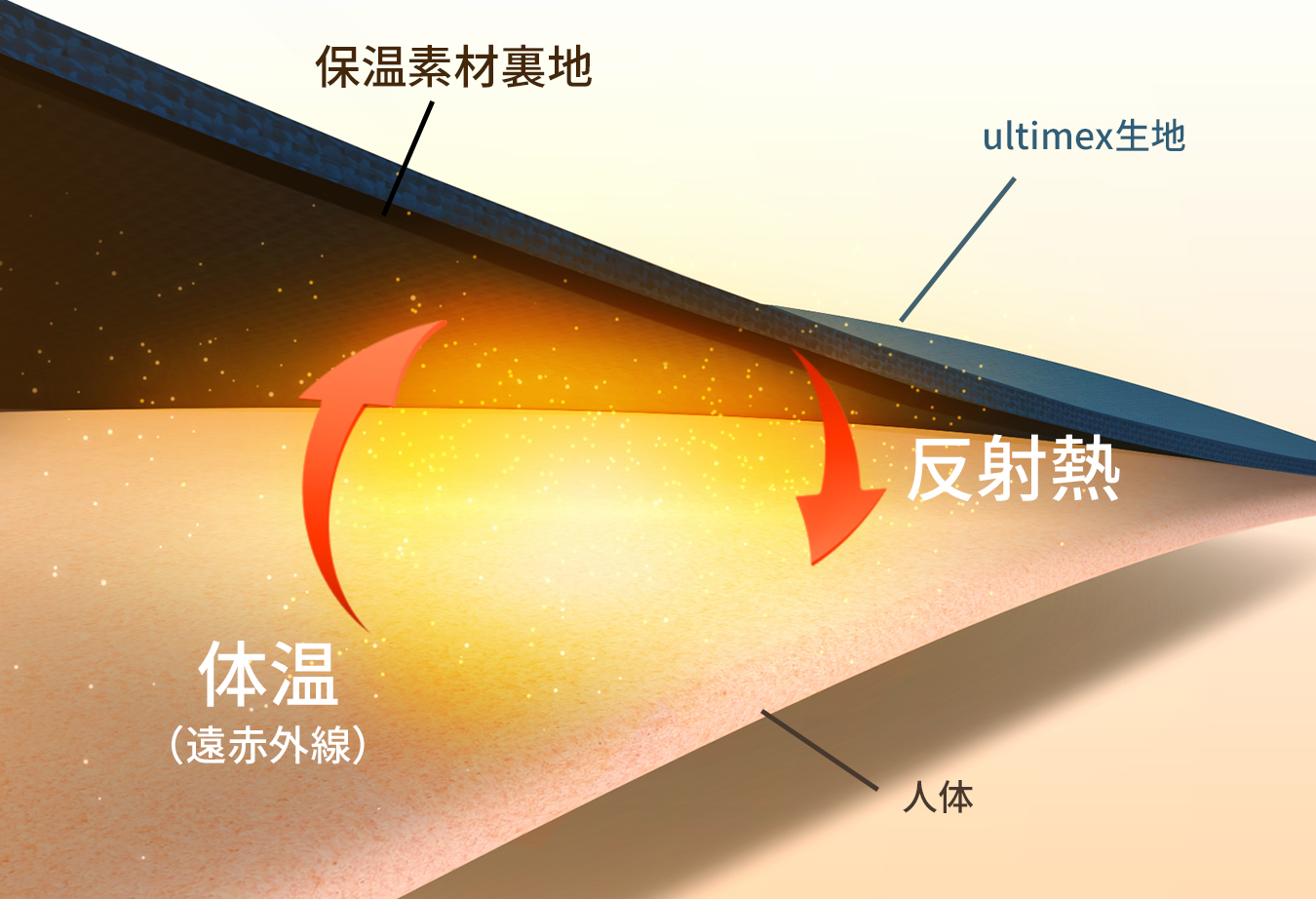 遠赤外線を反射するミクロ粒子を繊維に練り込んだ“特殊裏地”を全面に使用。身体から発生する熱(遠赤外線)を利用し、優れた蓄温保温効果を実現します。
