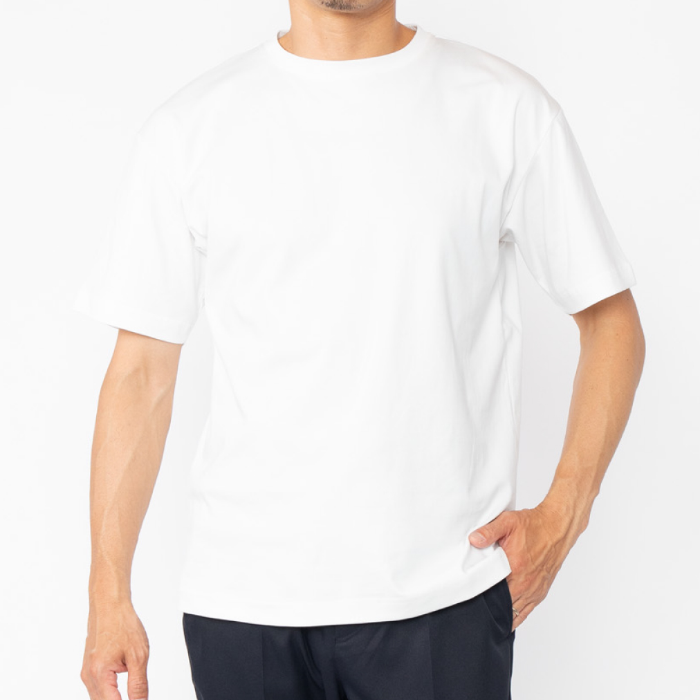 今どきのゆったりシルエットだけど、着丈が短いのでそんなに大きく感じません。ジャケットを羽織ってもバランスがいい。少し光沢のある生地で肌触りも最高です